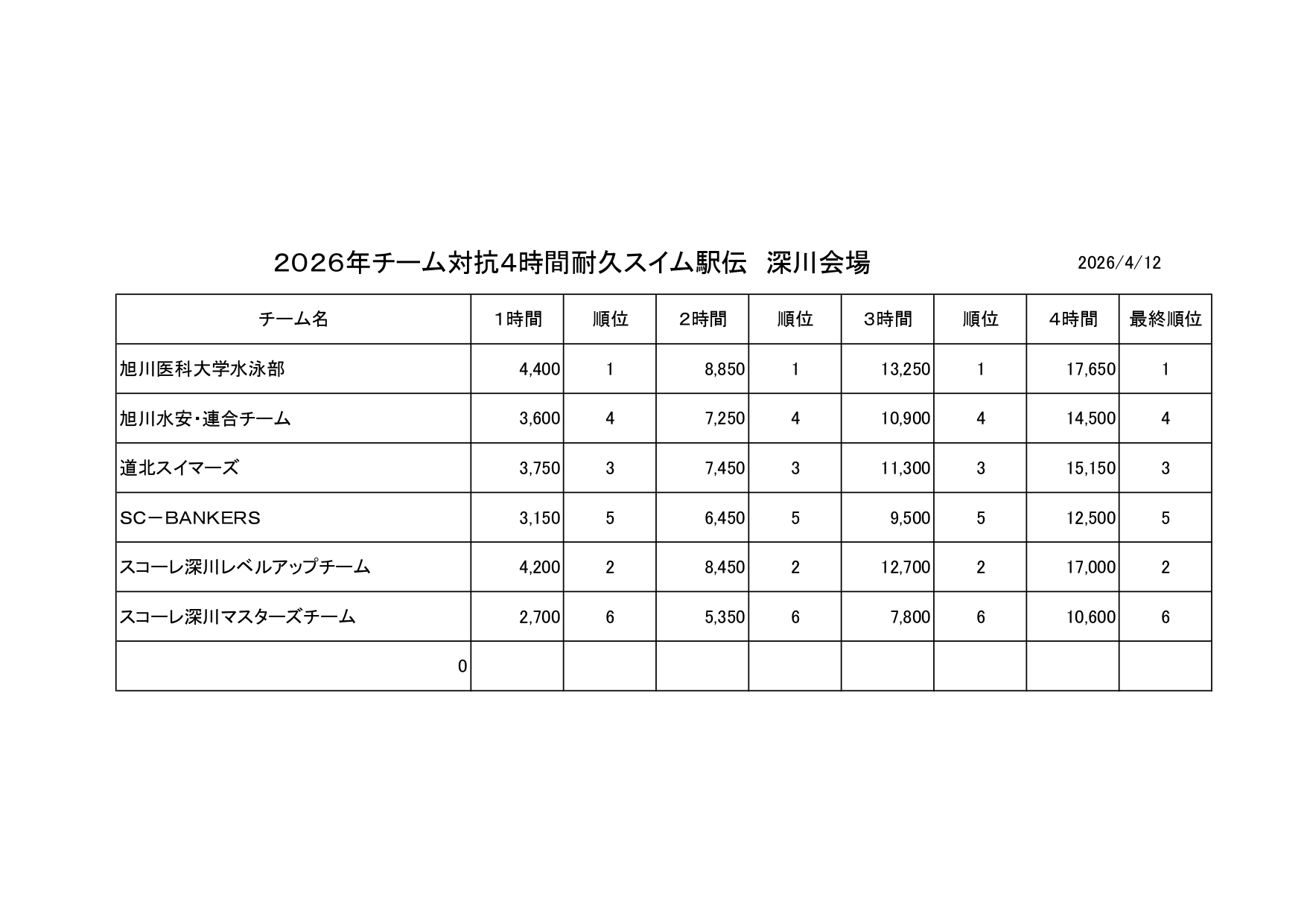 1位は旭川医大水泳部、2位は深川の選手チームでした、結果はこちら
